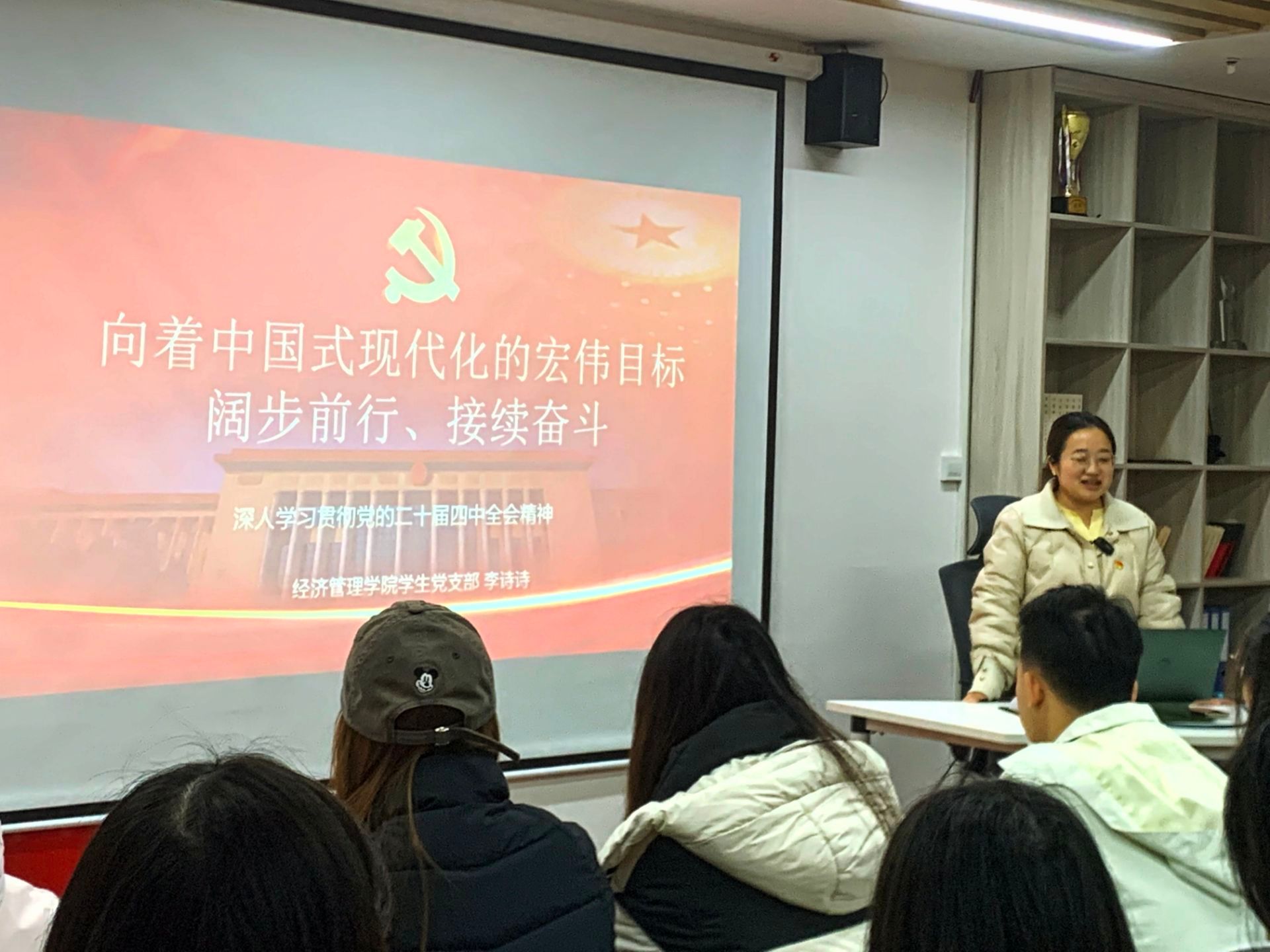 为深入学习领会党的二十届四中全会精神,切实把我院学生的思想和行动统一到党中央决策部署上来,学生党支部于12月8日在醇和楼508开展专题党课,党课以“深入学习贯彻党的二十届四中全会精神”为主题,引导同学们以实干担当助力中国式现代化建设。本次课程由学院学生党支部书记李诗诗老师主讲,学院在校发展对象和入党积极分子共计60余人参与学习。