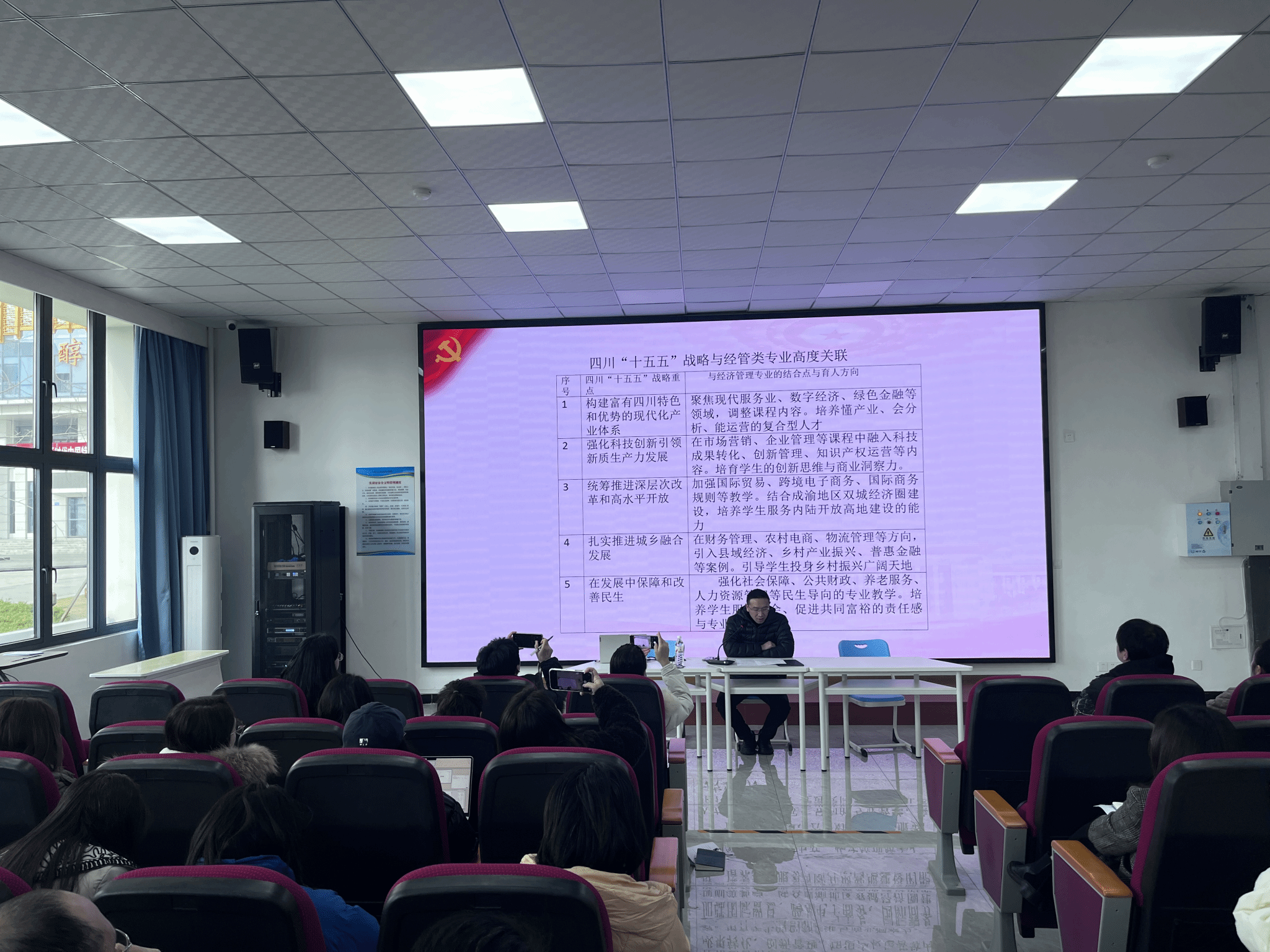 在解读省委十二届八次全会精神时,徐淳结合四川省“十五五”发展战略和经济管理学院学科特色及发展定位,详细分析了经济管理学院各专业的育人方向,指出专业需聚焦现代服务业、数字经济、绿色金融等领域,调整课程内容,培养懂产业、会分析、能运营的复合型人才。全体教师应牢牢把握高质量发展这一主题,以改革创新为根本动力,推动人才培养的质量和学校办学能力的进一步提升。