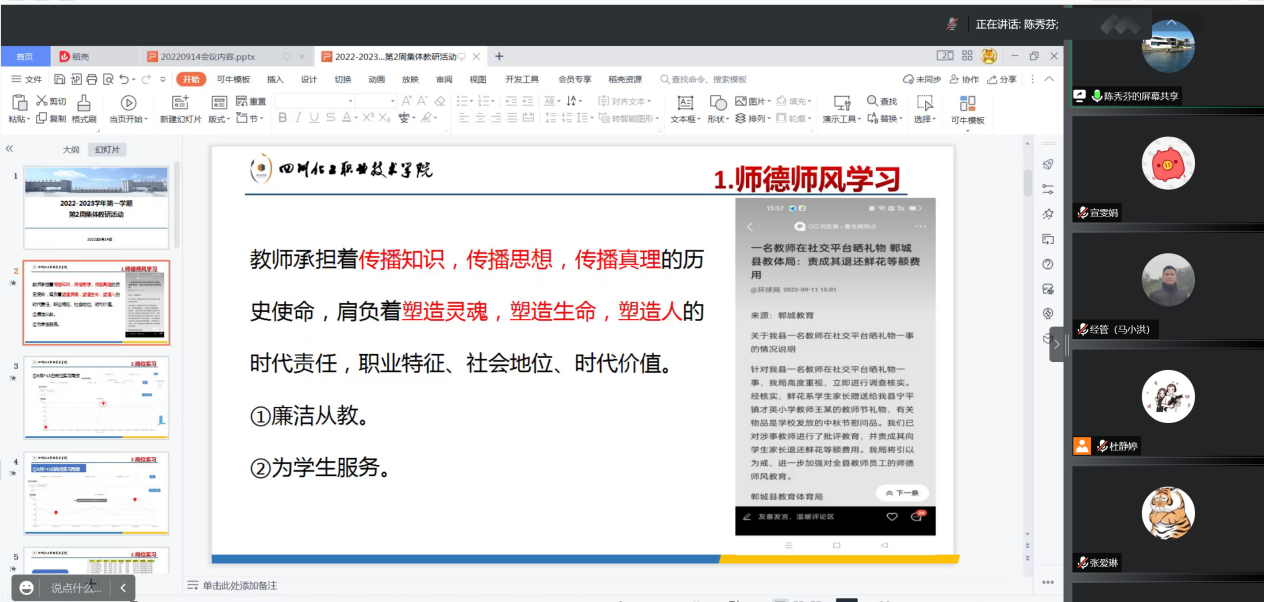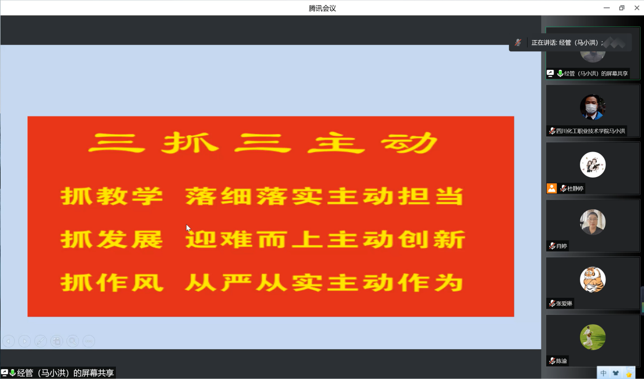 经济管理学院副院长陈秀芬针对“抓教学,落细落实主动担当”,重点从师德师风建设、岗位实习管理、诊改和双高工作推进、学生技能大赛准备、本周网课督导情况总结等方面进行了阐述,提出工作要求和改进建议。