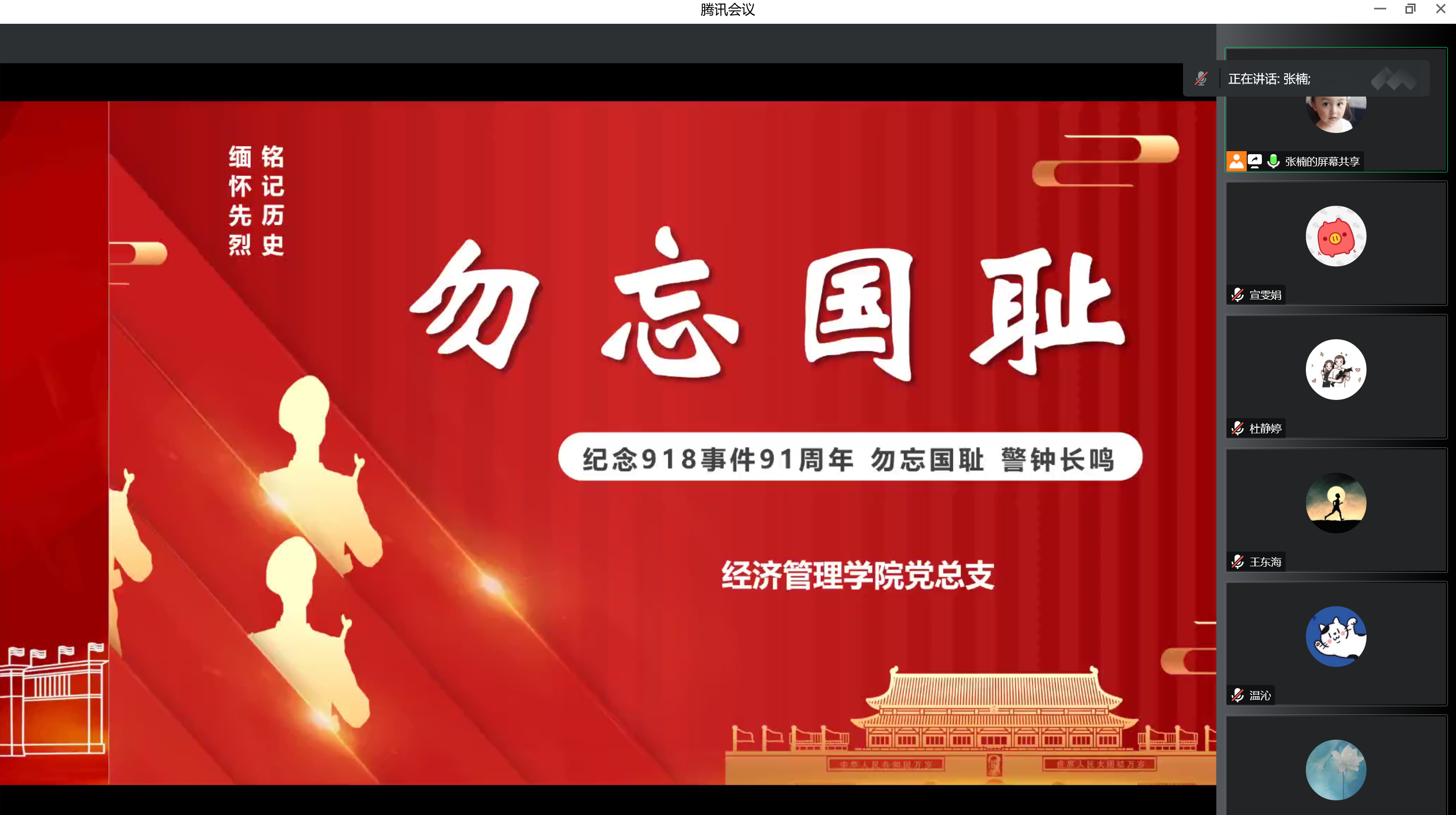 9月21日下午,经济管理学院党总支组织全体教师通过腾讯会议开展了“缅怀先烈 铭记历史 勿忘国耻”——纪念“九一八事变”91周年主题党日活动。活动由经济管理学院教师党支部书记张楠主持。