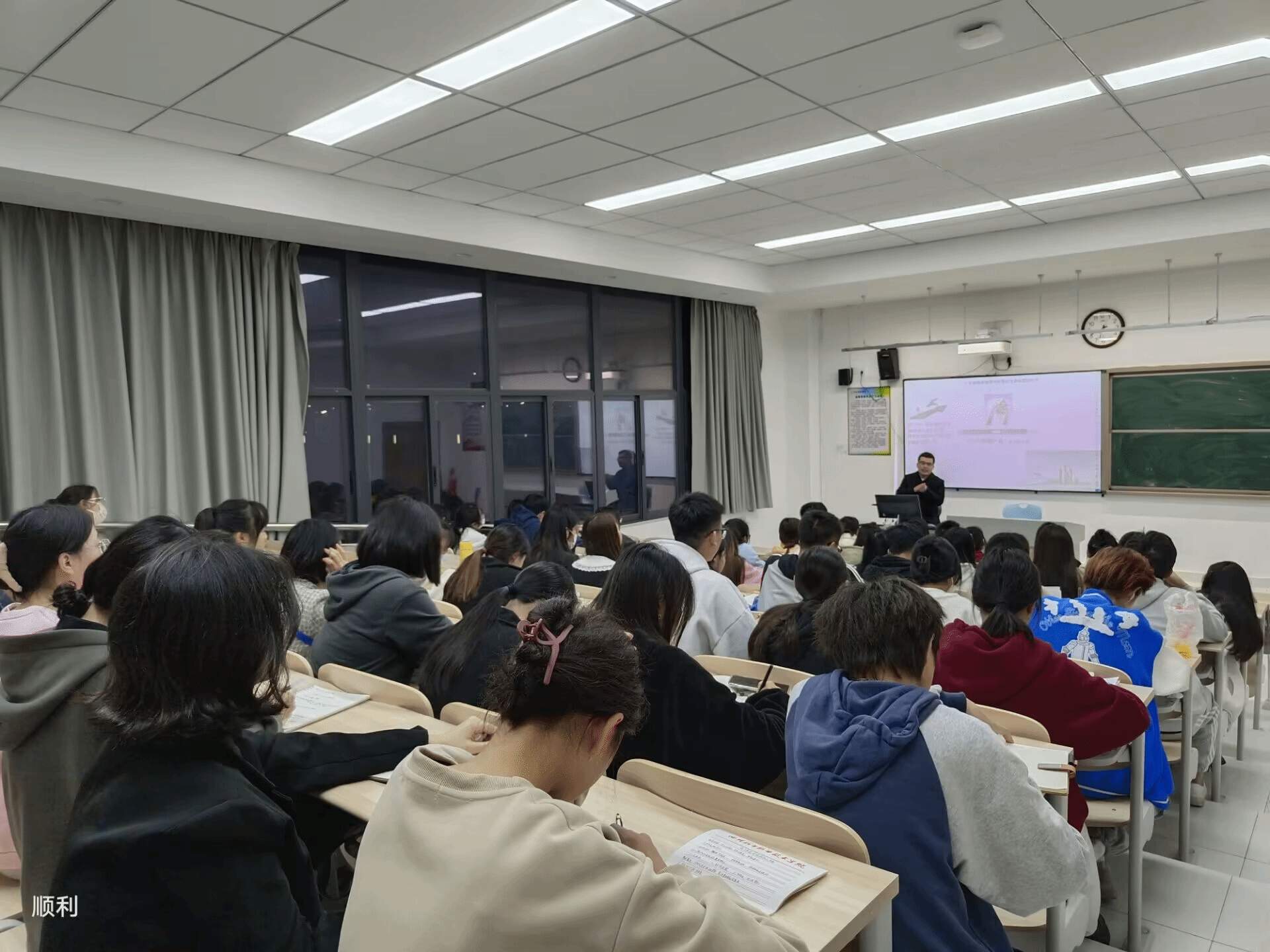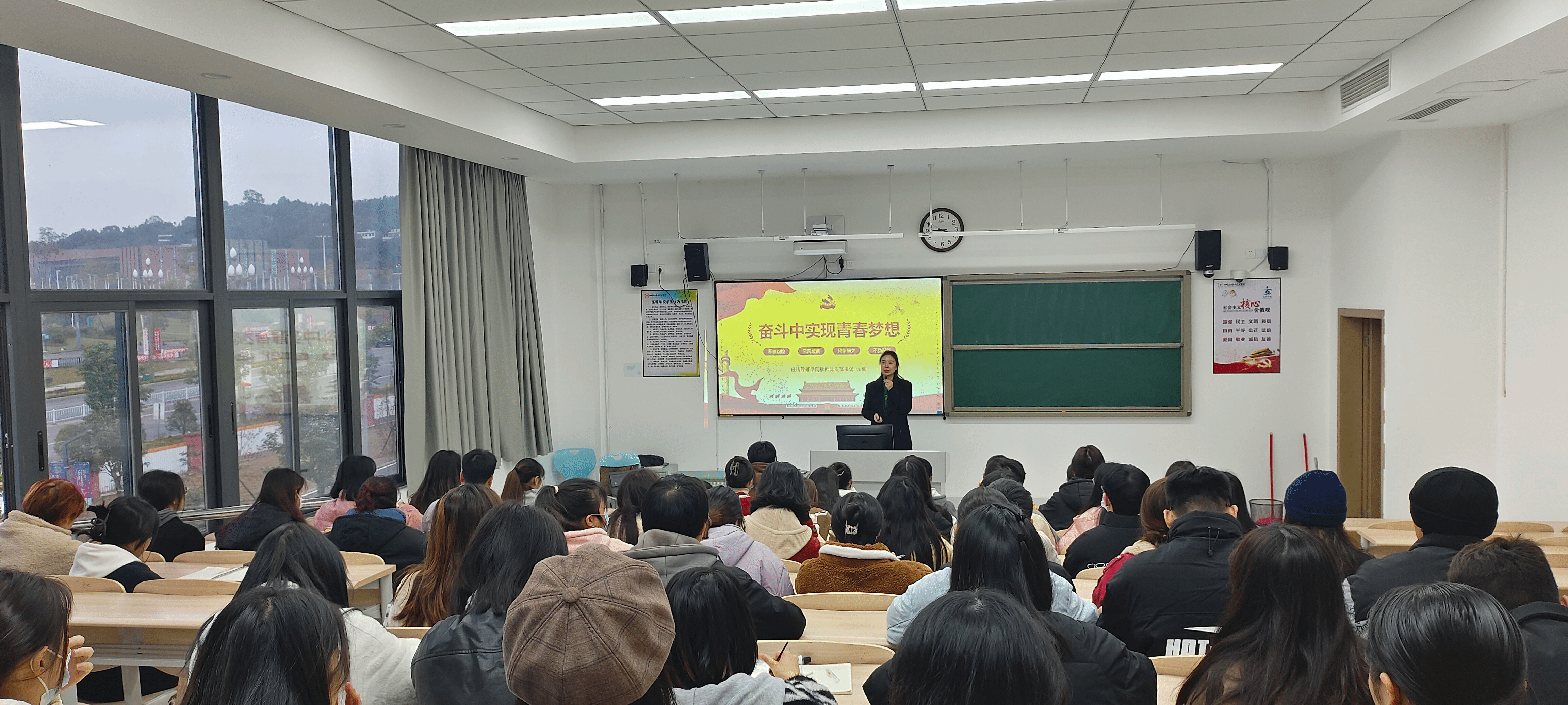 课程分别围绕“在奋斗中实现青春梦想”和“学习中国式现代化之路”为主题展开。在课程开始时,张楠老师提出“当代青年,梦想如何绽放,人生何以出彩?”的问题,引起同学们深思。以自身经历举例劝诫同学们抓住一切机会学习,争当先锋模范榜样,争做堪当民族复兴大任的时代新人。王东海老师提出两个一百年目标并询问同学们中国式现代化是何时开始的、什么是中国式现代化等问题。