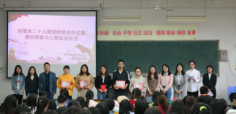 最后,系领导和老师为本期党校优秀学员代表安利落么等4位同学和青马班优秀学员代表吴艳丽等4位同学颁发了荣誉证书,并合影留念。至此,经济管理系第二十九期党校暨第四期青马班的结业仪式圆满结束。