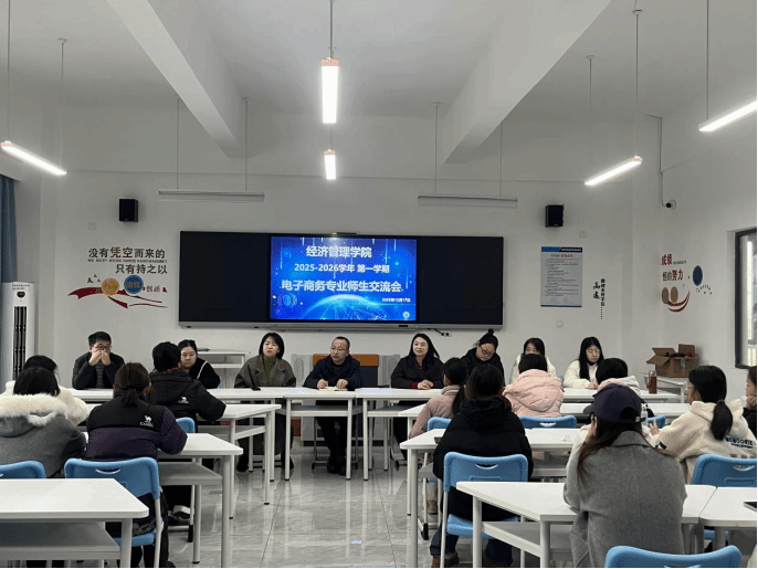 12月17日,经济管理学院电子商务专业在醇雅楼205举办了2025-2026学年第一学期师生交流会。经济管理学院副院长周圣毅、营销专业群教研室主任宋春燕、电子商务专业负责人郭栩杏、教学团队教师、辅导员和各班学生代表参加了此次会议。