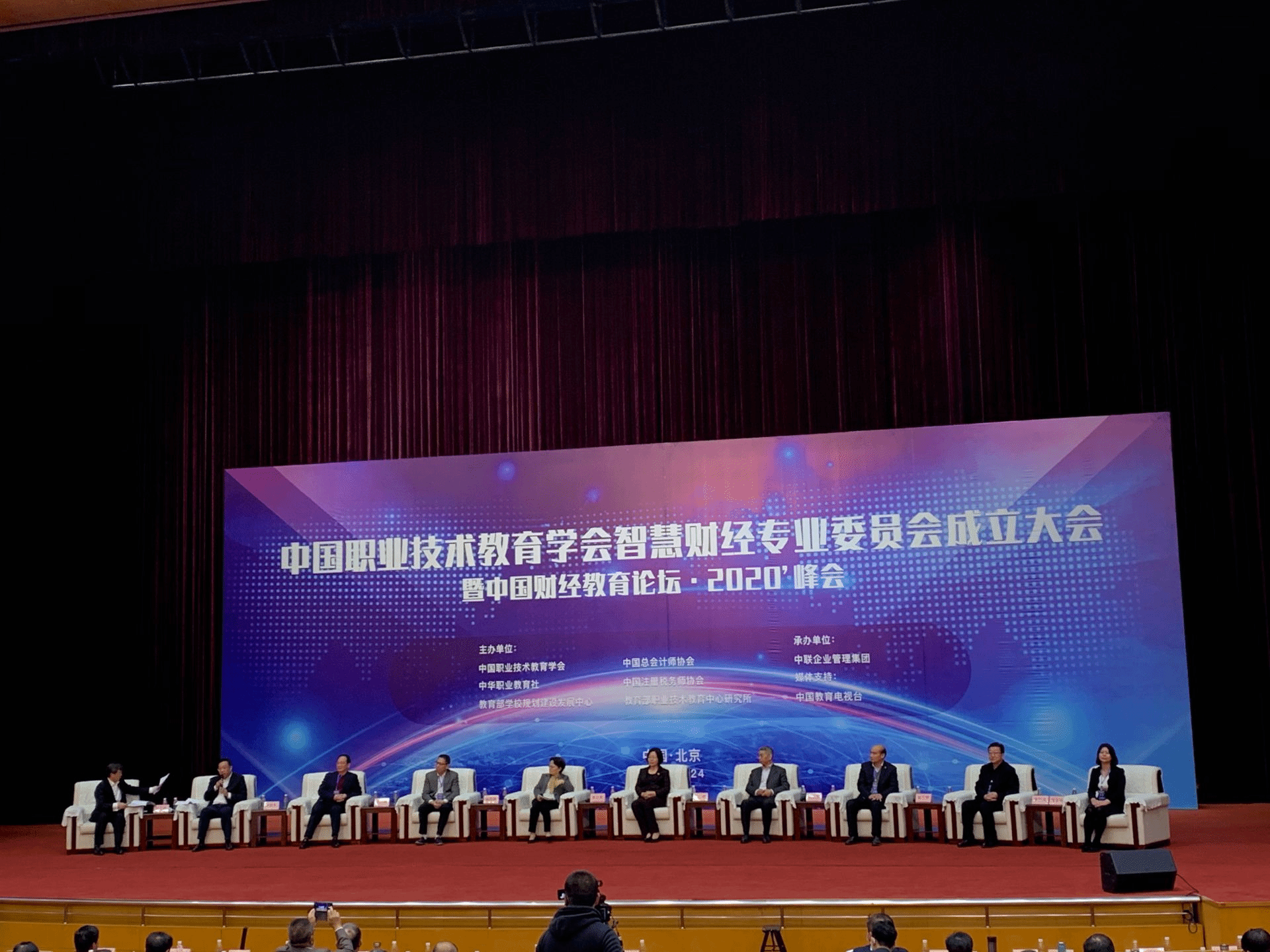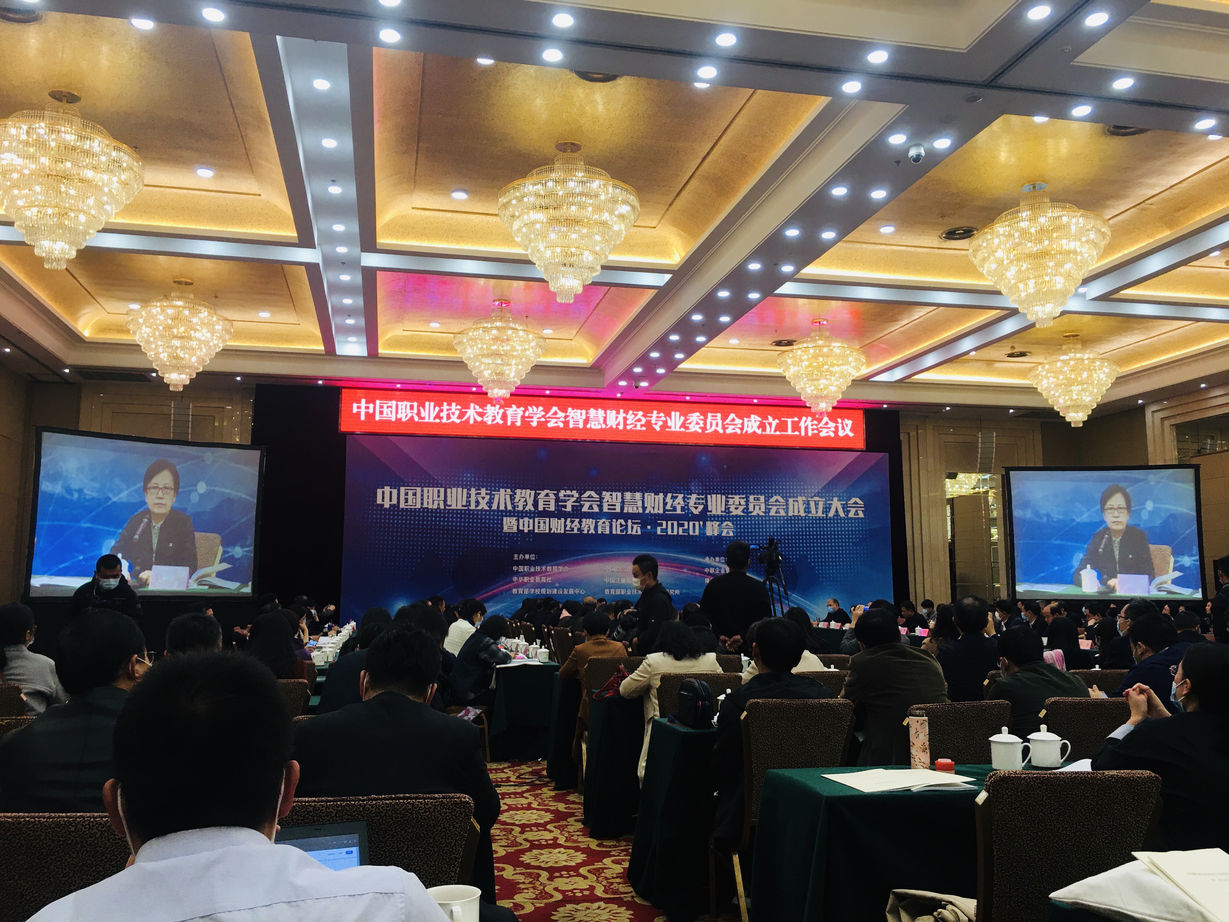 中国职业教育学会智慧财经专业委员会成立大会暨中国财经教育论坛·2020峰会于10月23日晚在北京会议中心开幕,会议由中国职业技术教育学会、教育部学校规划建设发展中心等单位联合主办。第十二届全国人大常委会副委员长陈昌智,中国职业技术教育学会会长、教育部原副部长鲁昕以及教育部有关司局领导等著名专家学者参会。我校经管学院钟倩玉和余婧两位老师代表我校参加了此次会议。