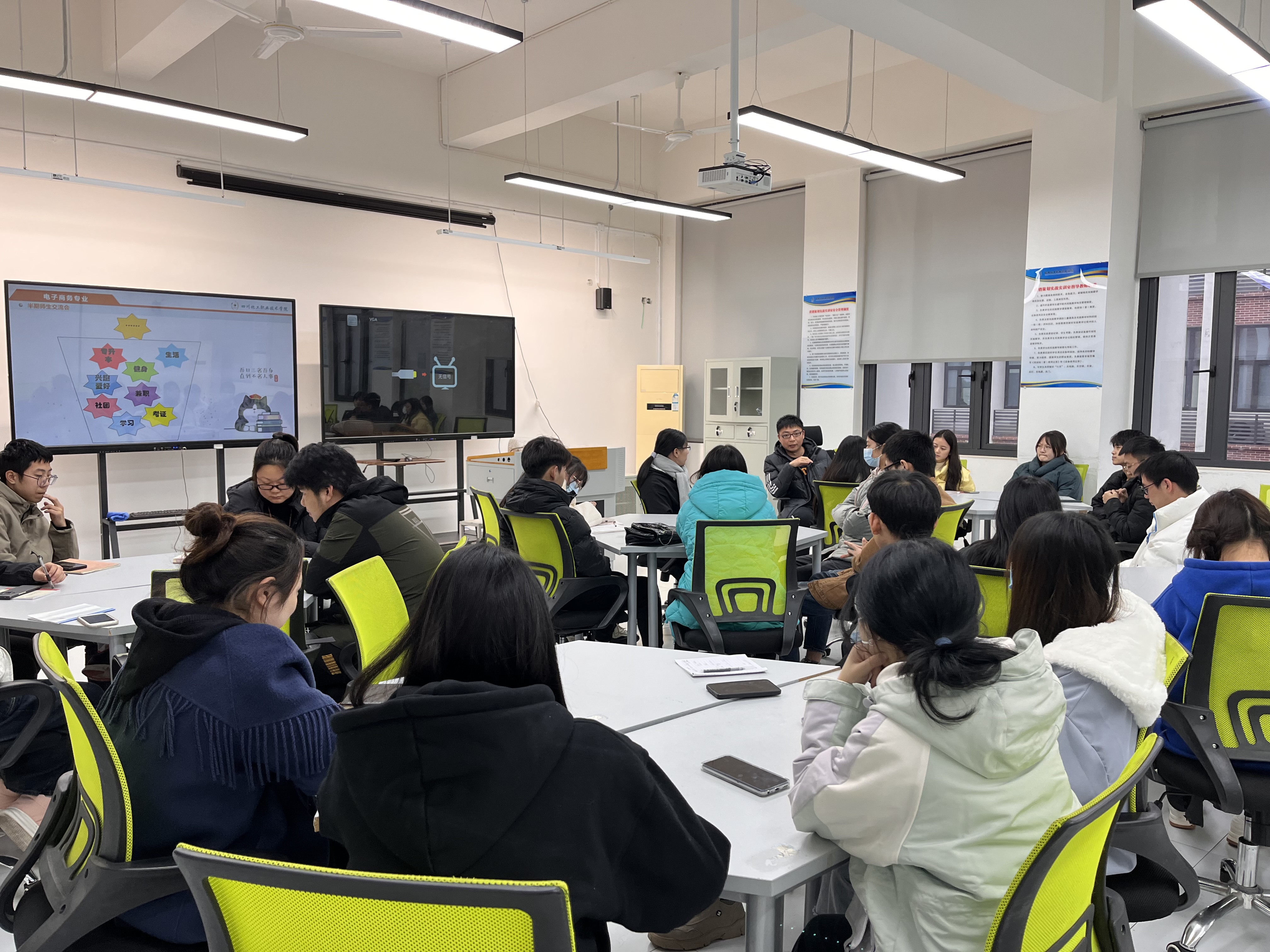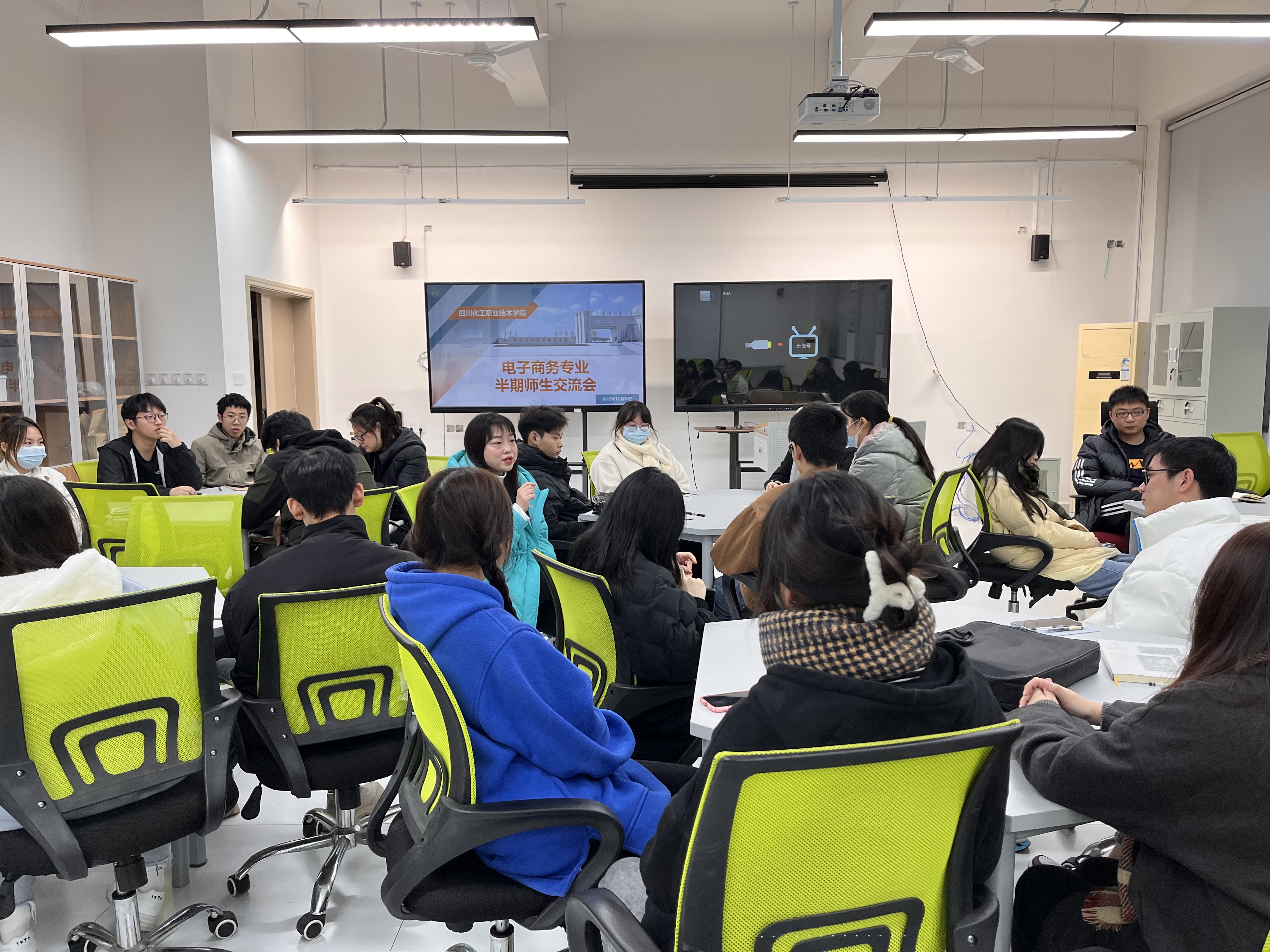 为更好的服务于学生,了解学生,解决学生普遍存在的疑问,2022年11月30日,经济管理学院电子商务专业师生交流座谈会在实训室8B303举行。会议由电子商务专业负责人郭栩杏老师主持,电商专业教师、辅导员及三个年级学生代表参加了交流座谈会。