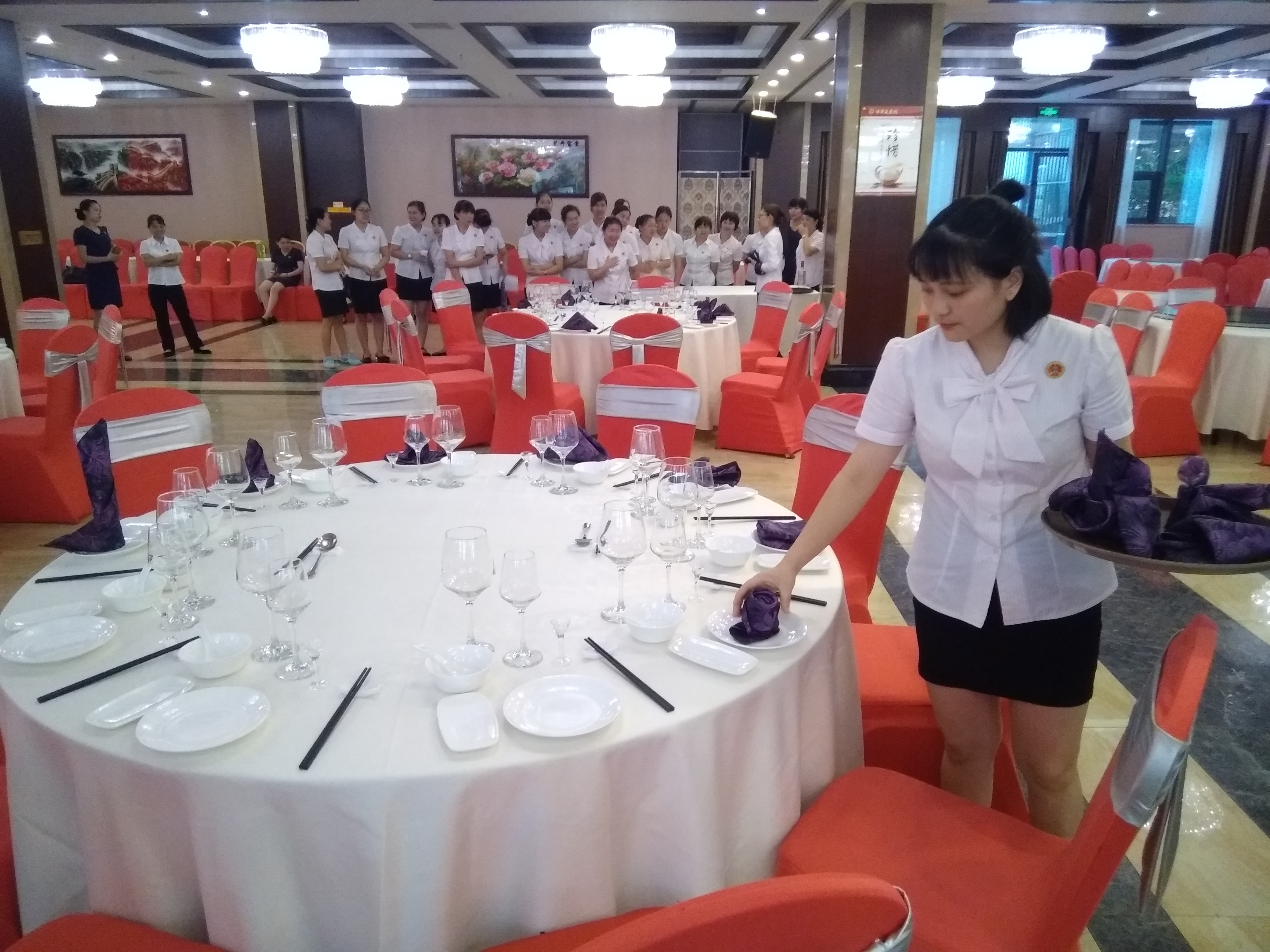 在出师考核中,由沣泽苑宾馆的三位师傅先作示范摆台,六位同学在其后进行摆台考核,由学院老师、宾馆餐饮部钟经理、游经理组成的考核小组对其进行评分。